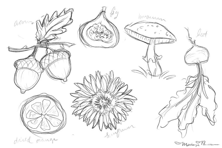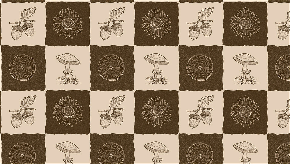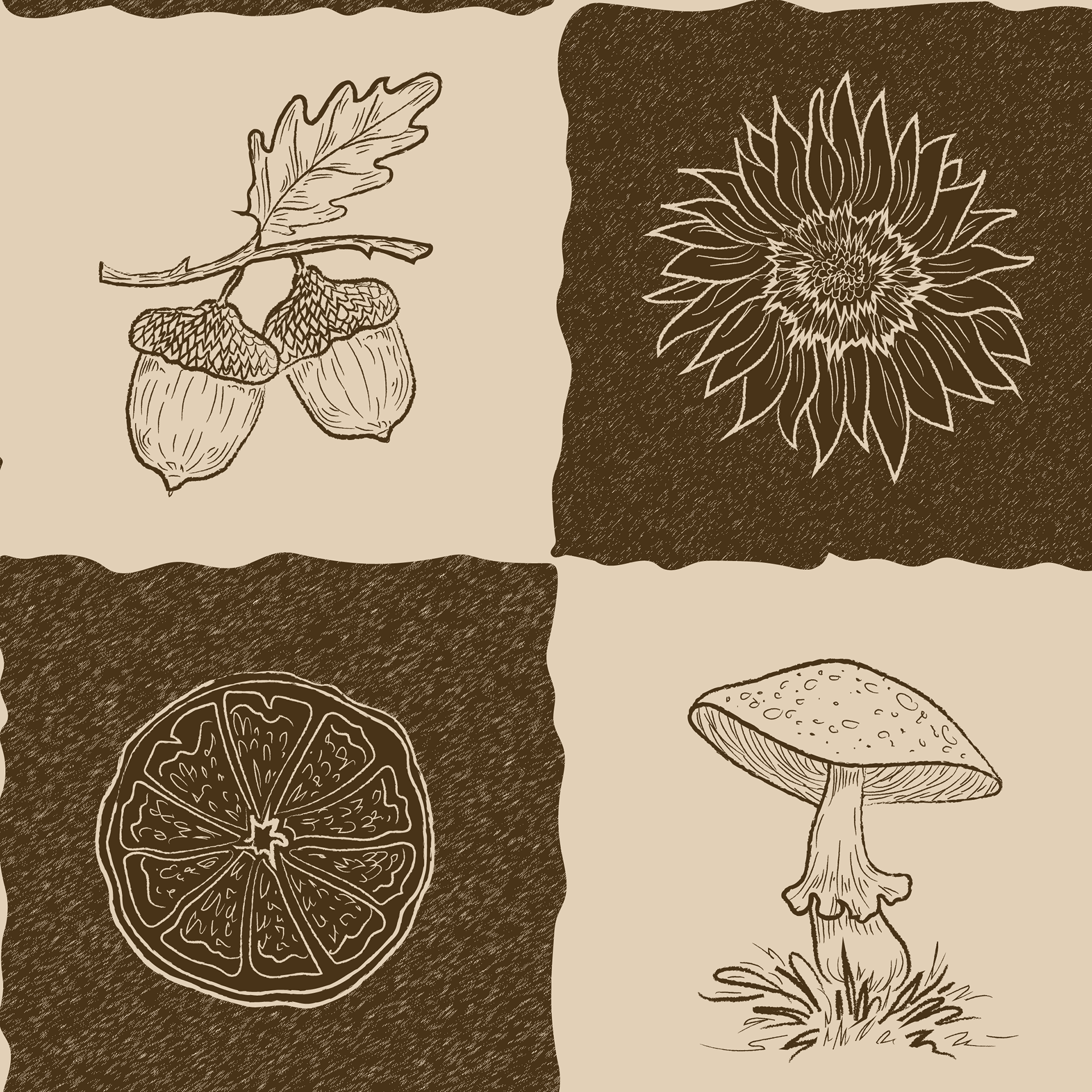 A repeating pattern featuring autumn harvest/foraging motifs.