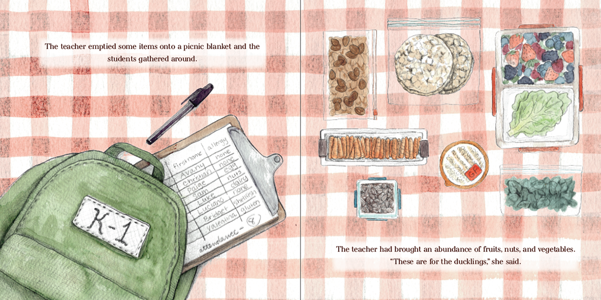 “Arlo - The Gluten-Free Duck gave me much to enjoy. Along with the premise, which succeeds in introducing young readers to food sensitivities through an approachable and heartwarming story, one of my favorite parts was the impeccable quality of the illustrations. The pictures, gentle-looking and soft in their colors, added warmth and emotional clarity to the book, guiding the young reader's attention by anchoring each scene with clear, readable emotional signals, and helping kids understand Arlo's reactions to food, uncertainty, and reassurance. Some of the best visual moments for me were the ducks swimming in the pond on page 6 and the picnic setup on page 13 [both pictured below]. I also have to add that, as authors, you show a strong understanding of the picture book form, including how much text to include on each page and how to calibrate vocabulary for the intended age group. These factors carried the book to the top 3% of entries.”