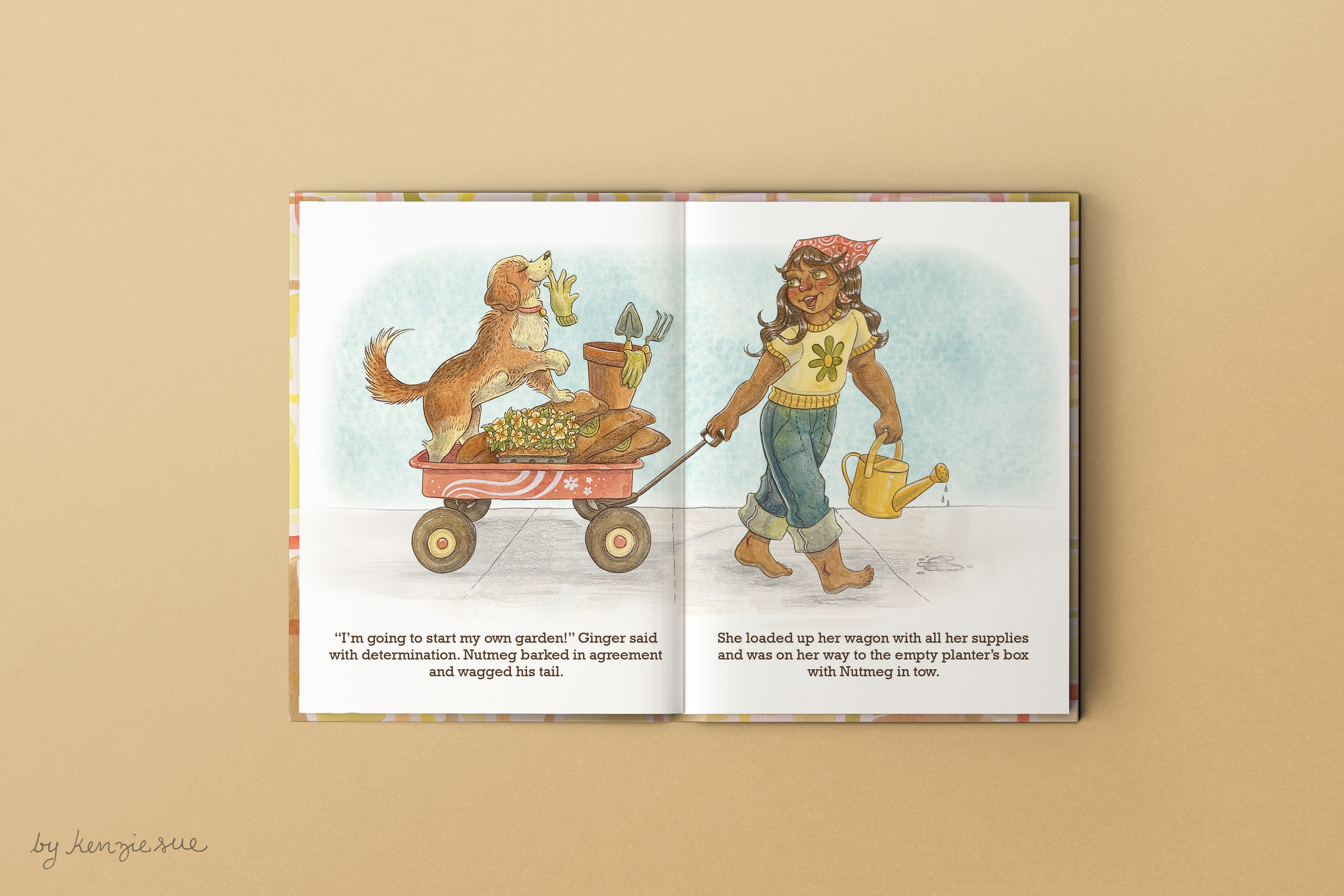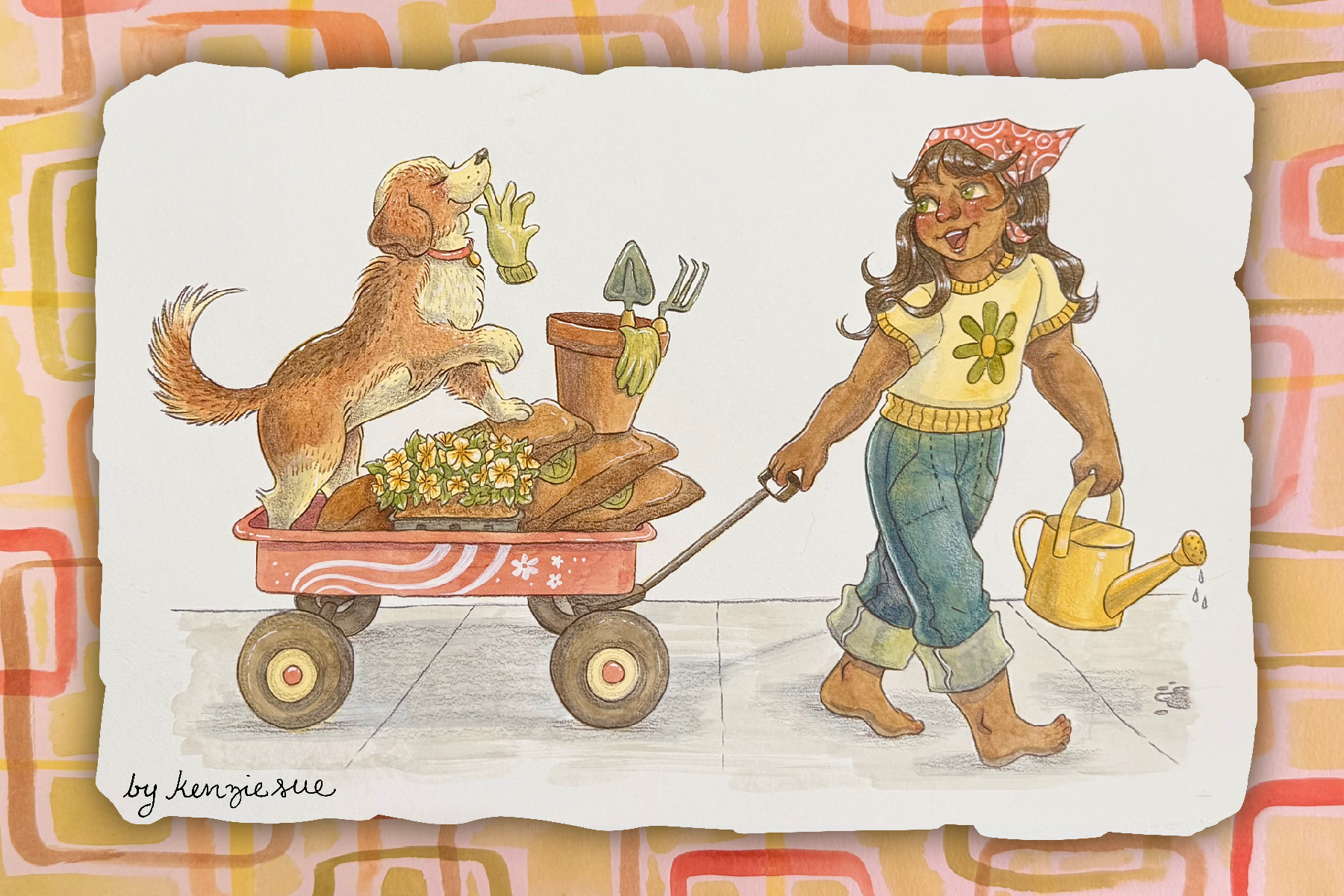 This piece was created for National Little Red Wagon Day, which takes place every year on the last Wednesday in March. Inspired by the Retro work of Sarah Kay and Denise Holly Hobbie, this piece titled "Ginger's Garden" could be used as an interior spread for children's book about gardening.