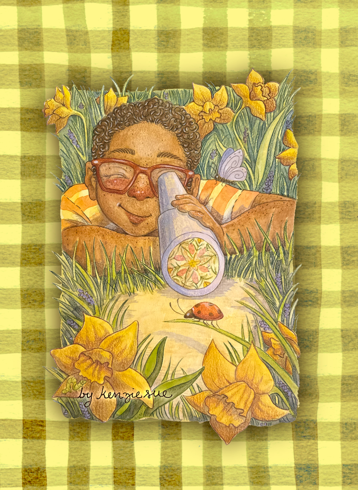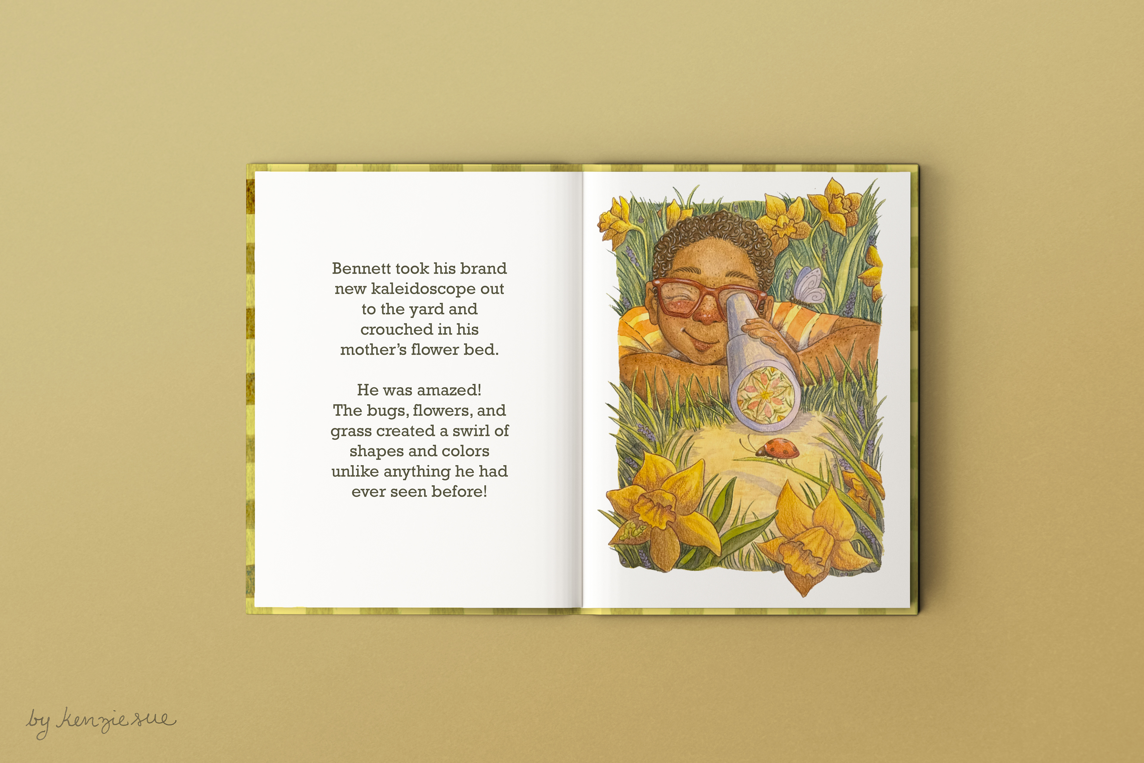 "Bennett's in the Flower Bed" was created for the SCBWI’s monthly Draw This challenge. March's prompt was “Kaleidoscope”. This was created traditionally using colored pencil and watercolor. The book spread was designed using InDesign and Photoshop.