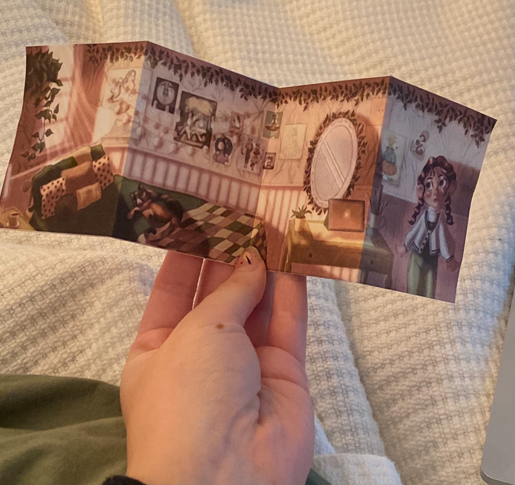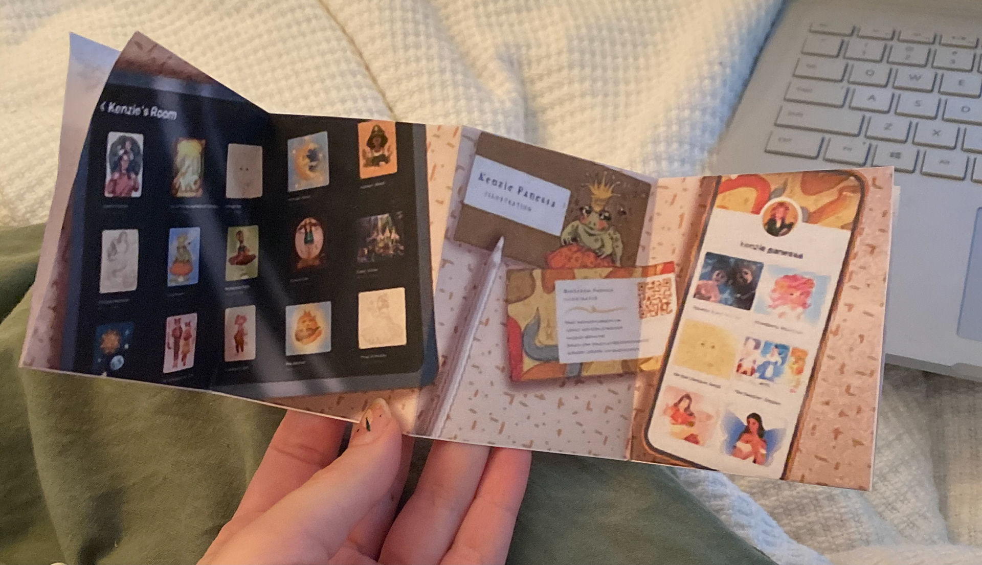 This was a double-sided pamphlet (almost like a zine) for personal branding and marketing. Made to be a sort of mailer or item to hand to clients instead of a business card. The idea behind this card was to show examples of my artwork in a way that would showcase how prints would look in someone's space. Also meant to be a glimpse into the artist's room and workspace.