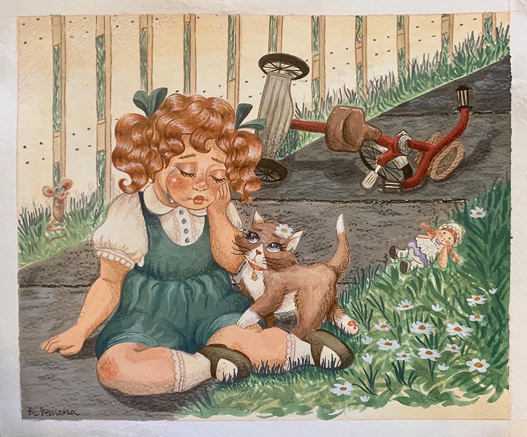 "Why Do Cats Purr?" was based off an article (provided by a professor, but similar to an article by "Scientific American") about how the frequency of a cat's purr can be used to not only comfort themselves and others, but it can also promote healing. This drawing is meant to depict this concept in the style of kitschy vintage Hallmark greeting cards, as cats seem to be a popular subject in this genre of illustration.